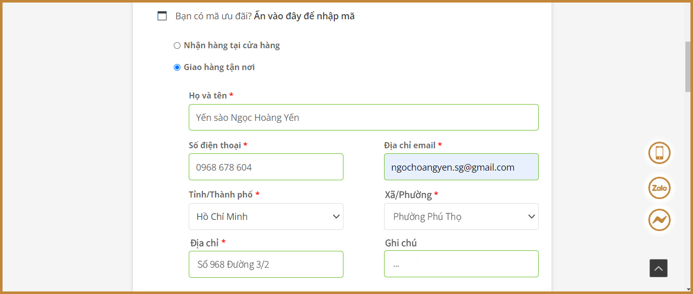 Nhập mã ưu đãi (nếu có). Lựa chọn phương thức giao hàng: Nhận hàng tại cửa hàng HOẶC Giao hàng tận nơi. Điền tất cả các thông tin bắt buộc như số điện thoại, email, địa chỉ.